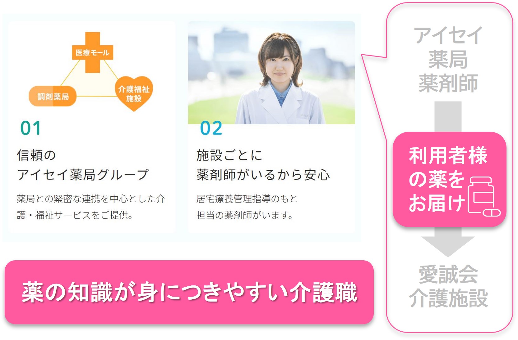 調剤薬局事業や医療モール開発などの事業を全国各地で推進しているアイセイ薬局グループの「株式会社愛誠会」です。お手伝いを必要とされるご高齢者の皆さまに、笑顔があふれる毎日をお過ごしいただくため、薬局と連携した介護・福祉サービスをご提供しています。