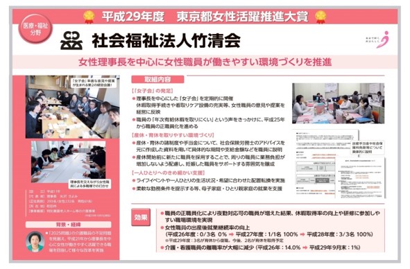 「幸せな暮らしと働き方を」ご利用者様のサービス向上、職員の幸福、働き方改革に取り組む。AI等の活用、教育、昇給、育休、キャリア向上、生活状況に合わせた配置・柔軟な勤務条件変更などが評価され、東京都女性活躍推進大賞を受賞。働きやすい福祉の職場宣言登録。